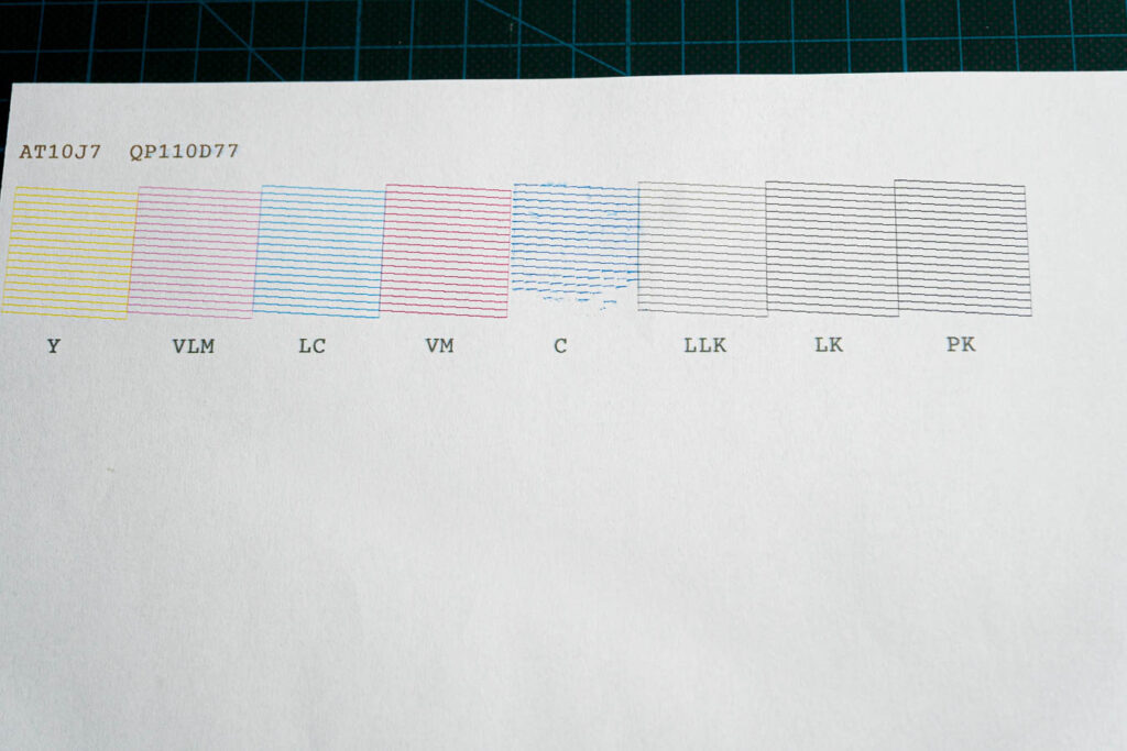 Ich mache auch vor jedem Druck einen Düsentest, um eventuelle Probleme bereits vorher zu erkennen und nicht erst dann, wenn ich ein 4 Euro teures FineArt-Papier dadurch versaut habe. Zumindest vor dem ersten Druck, sobald ich mehrere Bilder hintereinander drucke. Unten auf dem Testdruck sieht man sofort, dass die Cyan-Düse Probleme hatte. Nach einem Reinigungvorgang sah der Ausdruck wieder tadellos aus, so wie bei den anderen Feldern auf dem Bild. Danach konnte der Druckjob dann losgehen.