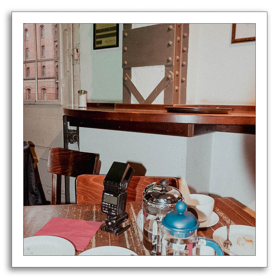 Die Kunst ist es, eine solche Wand oder vielmehr eine Stelle in der Wand zu finden, die das Licht aus der gewünschten Richtung liefert. Diese wird dann mit dem Blitz angezielt. Das ist alles. Sie muss nicht unbedingt weiß oder grau sein, jede Farbe funktioniert. Der daraus resultierenden Farbstich lässt sich nämlich mühelos im Bildbearbeitungsprogramm beheben. Sofern der Reflektor (also die angeblitzte Wand) allerdings nicht weiß ist, muss man eine Abnahme des Reflektionsvermögens in Kauf nehmen, was bedeutet, entweder den Blitz auf höhere Leistung zu stellen, oder die Filmempfindlichkeit hoch zu drehen (sofern man nicht an Blende oder Verschlusszeit fummeln möchte). Von daher ist ein Blitz mit höheren Leitzahlen sicherlich von Vorteil, sobald man das indirekte Blitzen betreiben möchte.