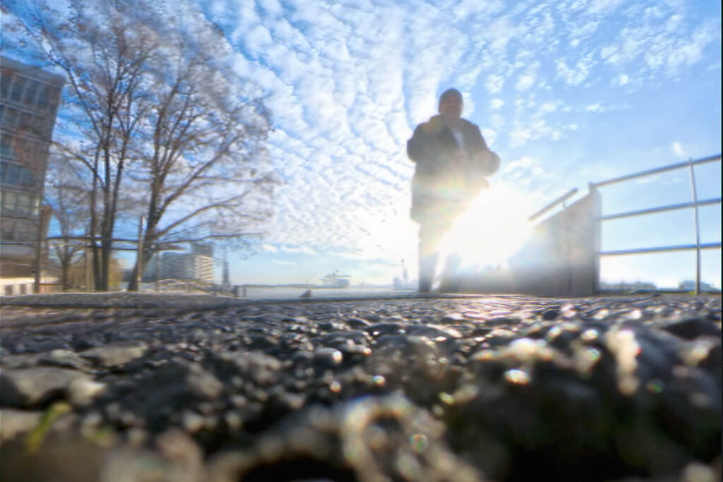 Für eine Szene an der Elbphilharmonie ging ich dann weiterer Richtung Wasserkante und trat damit, ohne dass mir das zu diesem Zeitpunkt bewusst wurde, aus dem Windschatten der Elbphilharmonie heraus. Zu dem Zeitpunkt war auch kaum Wind, die Bö kam halt kurze Zeit später.
