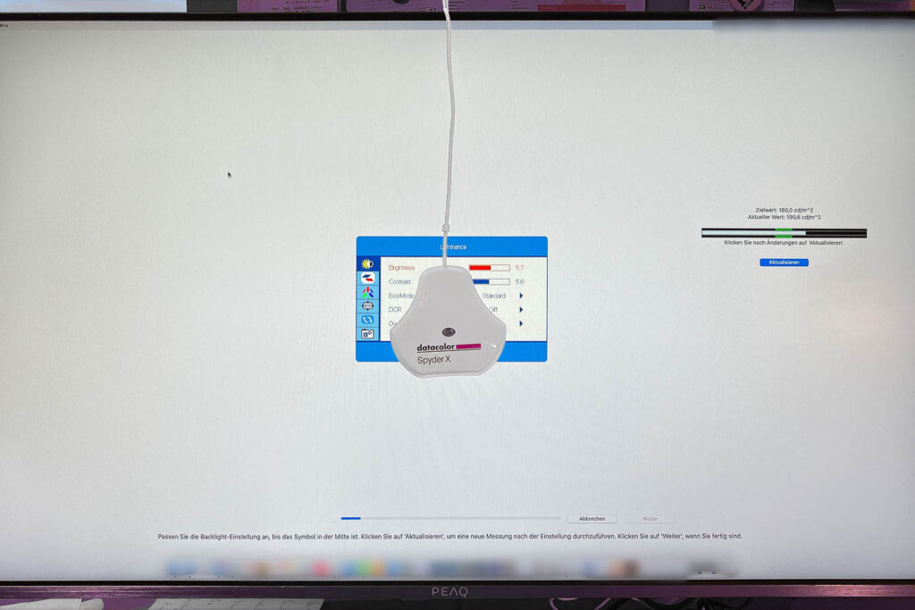 Wenn du während der Kalibrierung die Helligkeit anpasst und sofort im Spyder-Programm auf „Weiter“ klickst, ist die neue Helligkeit technisch noch nicht wirksam.